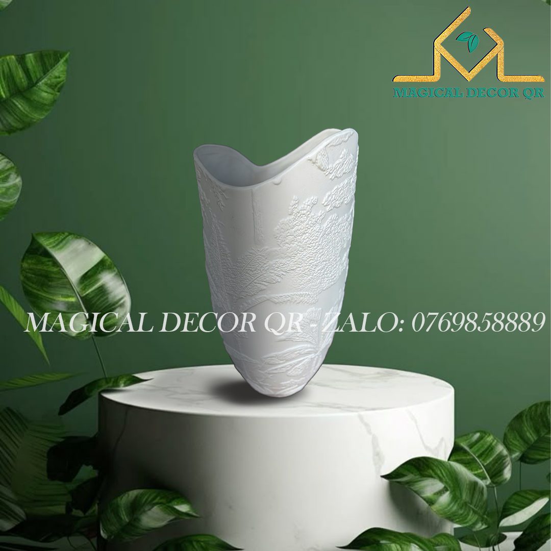 Bình Gốm Trắng mang thiết kế hiện đại, tối giản nhưng đầy tinh tế. Với kỹ thuật chế tác thủ công tỉ mỉ, từng chi tiết nổi khối (relief) được khắc họa sinh động, tái hiện hơi thở thiên nhiên trong tác phẩm nghệ thuật.