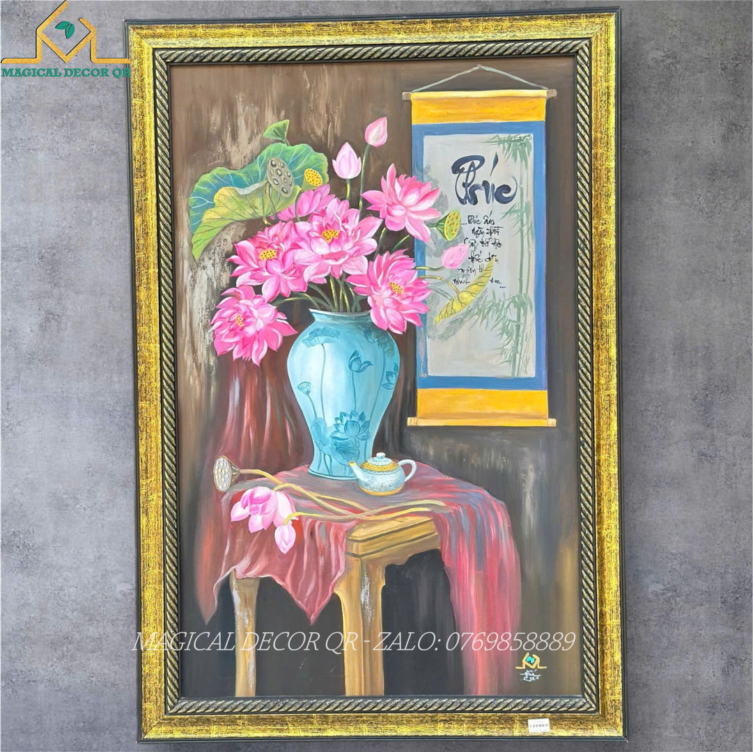Gam màu hồng sen nổi bật trên nền trầm ấm nâu gỗ, xen lẫn những nét xanh lam của bình gốm, tất cả tạo nên một tổng thể hài hòa, vừa cổ điển, vừa sang trọng. Bút pháp sơn dầu mềm mại, từng lớp màu đan xen khéo léo giúp cánh sen, chiếc lá, giọt sương như có hồn, sống động mà vẫn sâu lắng.