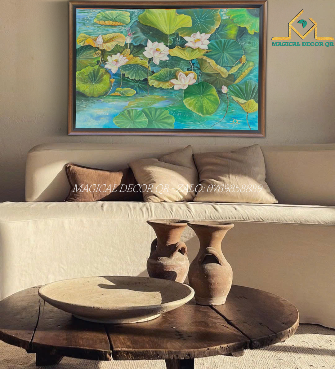 Tranh Sen Xanh Ngọc không chỉ là một bức tranh trang trí, mà còn mang thông điệp phong thủy sâu sắc là khoảng lặng tươi mát cho tâm hồn, để mỗi khi ngắm nhìn, bạn lại thấy lòng nhẹ nhàng, thảnh thơi và tràn đầy niềm lạc quan. Bức tranh cũng là lời cầu chúc thanh tịnh, may mắn và viên mãn cho gia chủ, thích hợp làm món quà ý nghĩa trong các dịp tân gia, khai trương, mừng thọ.