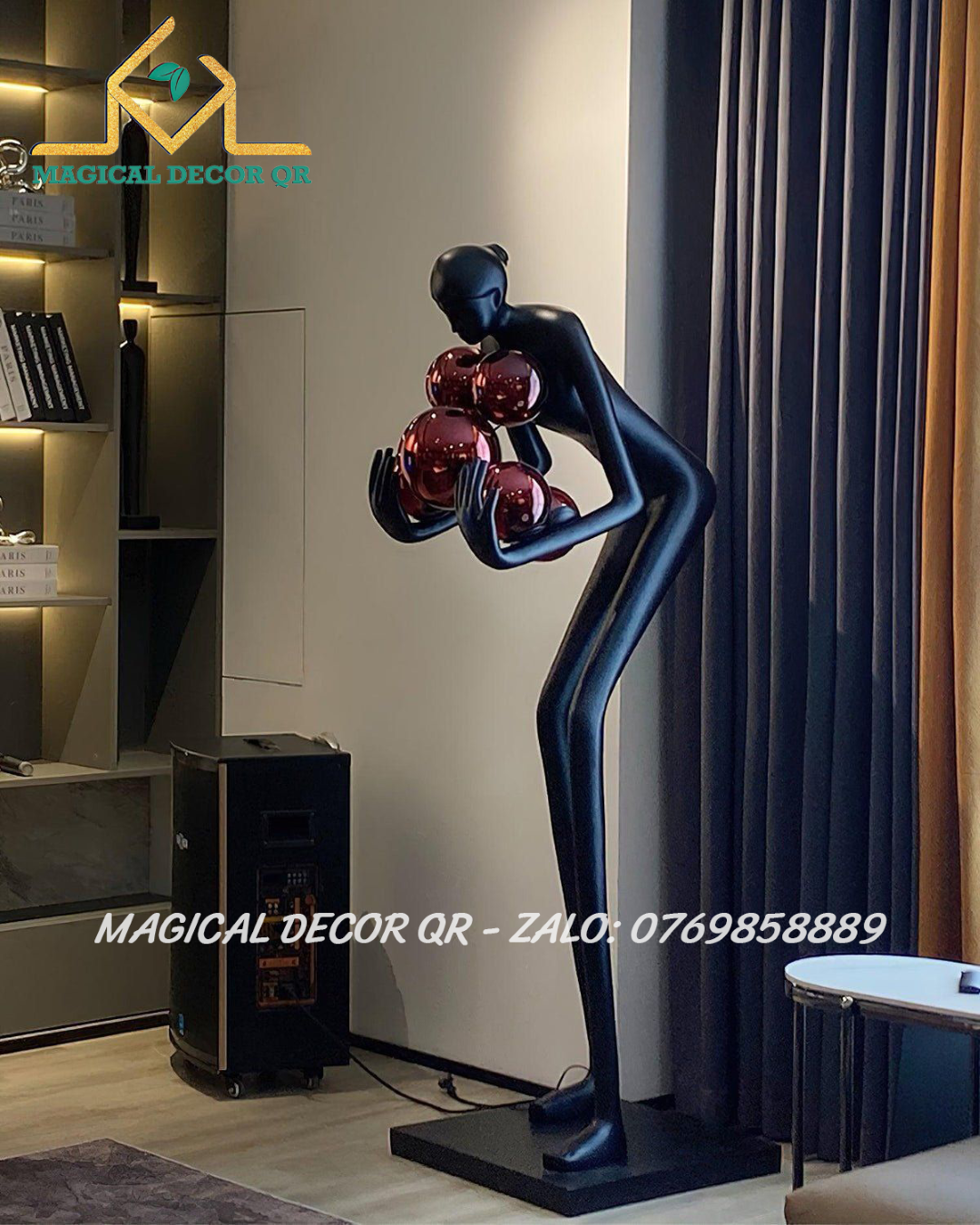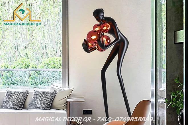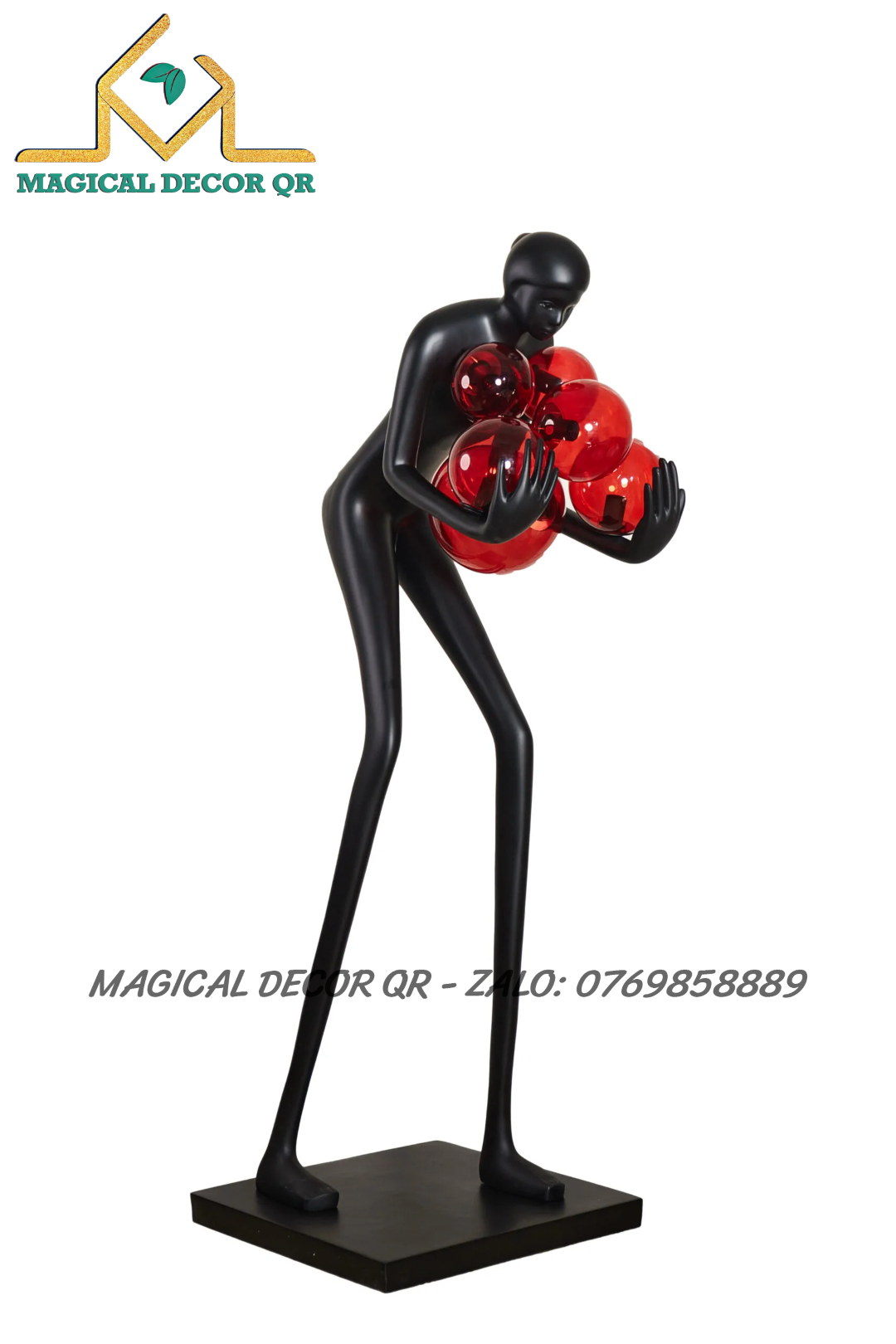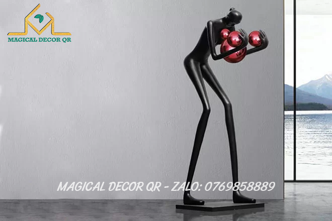 Tượng Đen Ôm Bóng Đỏ là tác phẩm decor mang đậm tinh thần nghệ thuật đương đại, nổi bật với hình dáng trừu tượng cùng cụm cầu ánh sáng sống động. Với tạo hình người nghệ sĩ cách điệu, đôi tay dài nâng niu những quả cầu ánh sáng xanh rực rỡ, sản phẩm gợi mở sự cân bằng giữa sức mạnh nội lực và vẻ đẹp tinh tế.