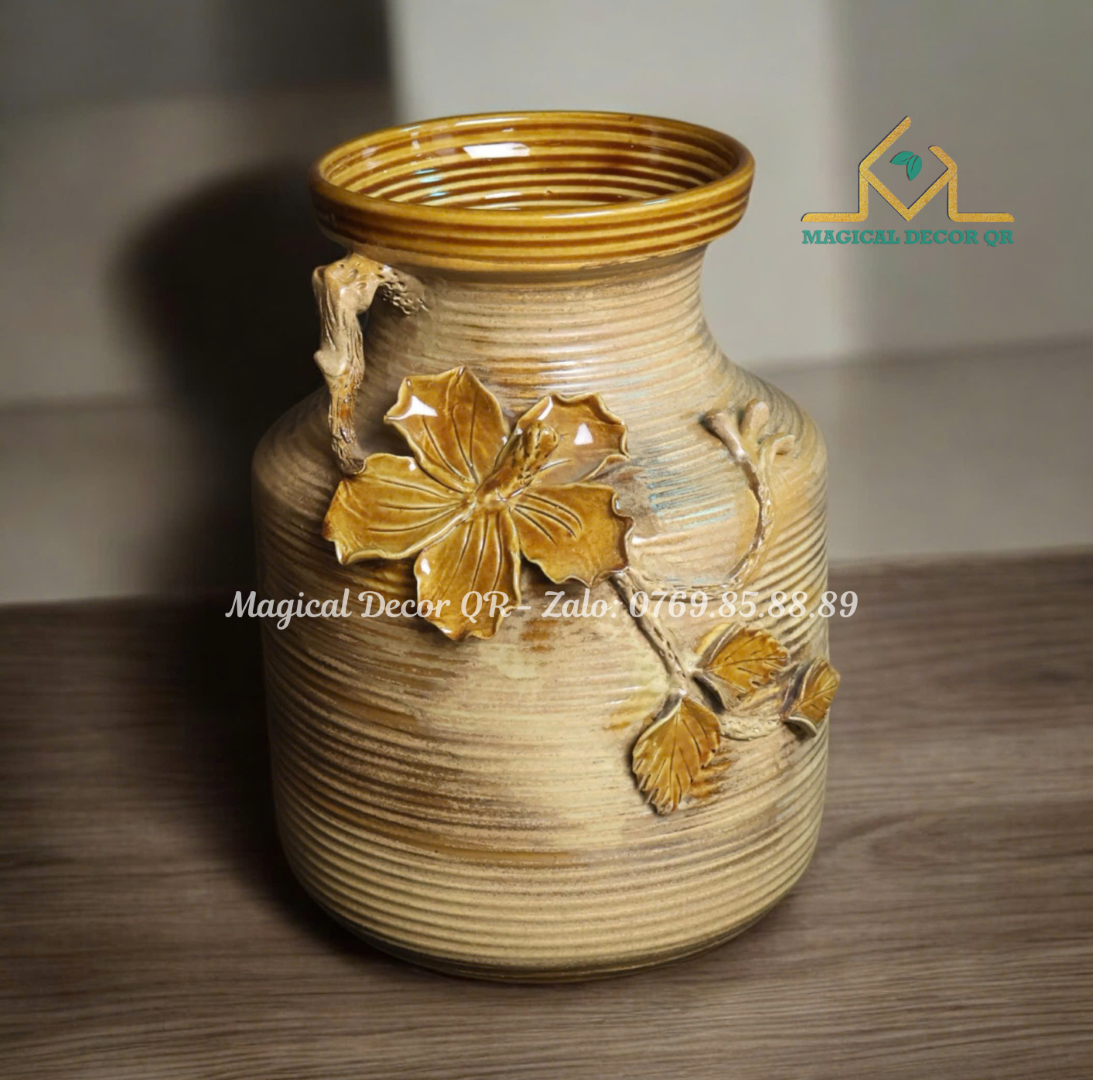 Được chế tác hoàn toàn thủ công bởi các nghệ nhân làng gốm Bát Tràng lâu đời, mỗi chiếc bình là một tác phẩm độc bản mang đậm dấu ấn cá nhân. Họa tiết đắp nổi tinh xảo kết hợp với lớp men sâu màu – kết quả của quá trình nung nhiều lớp ở nhiệt độ cao – tạo nên vẻ đẹp cổ điển, bền chắc và cảm giác "nặng tay" đặc trưng của gốm cao cấp.