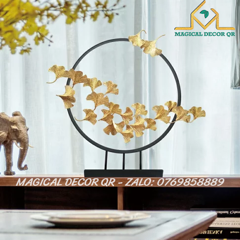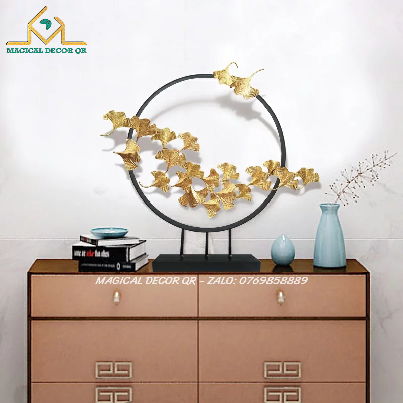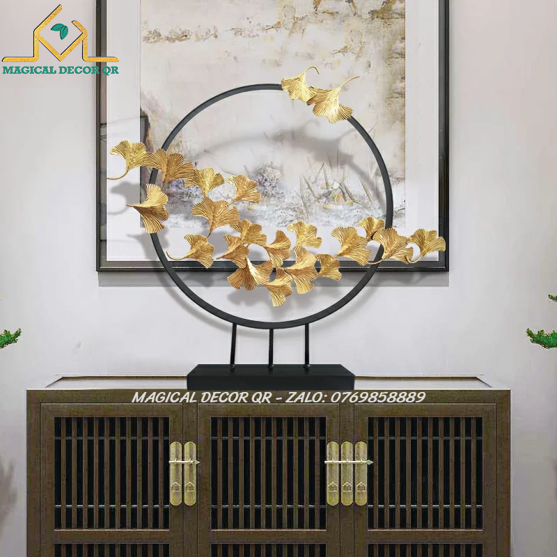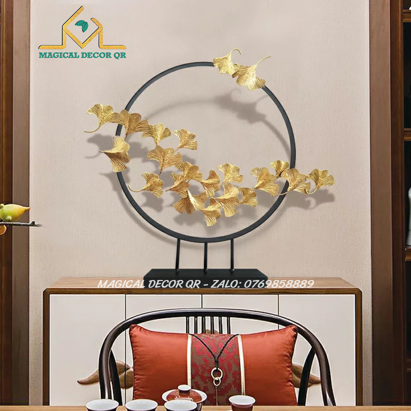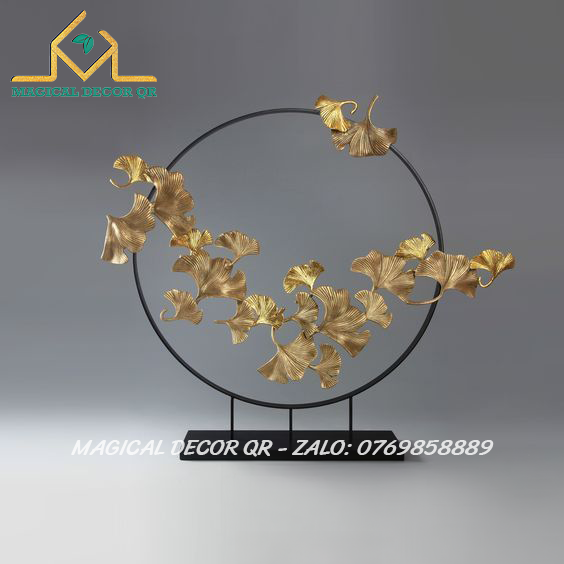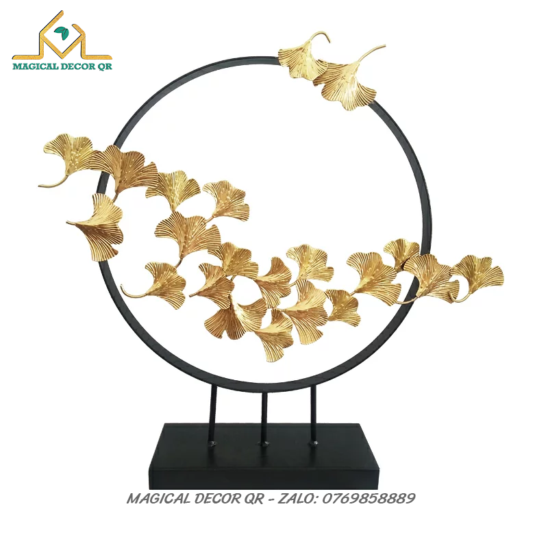 Vòng lá ngân hạnh – tác phẩm decor nghệ thuật được chế tác từ kim loại sơn tĩnh điện vàng gold, kết hợp đế đá vững chắc, mang vẻ đẹp thanh thoát và tinh tế. Hình ảnh lá bạch quả (ginkgo) tượng trưng cho sự trường tồn, vững bền và may mắn, tạo điểm nhấn sang trọng cho không gian sống hiện đại.