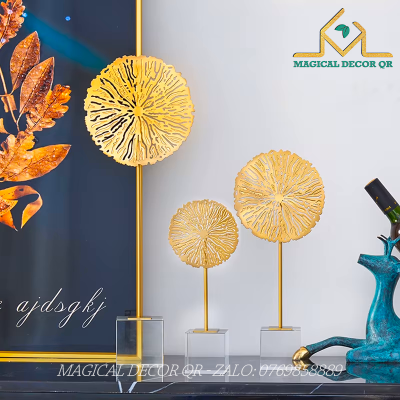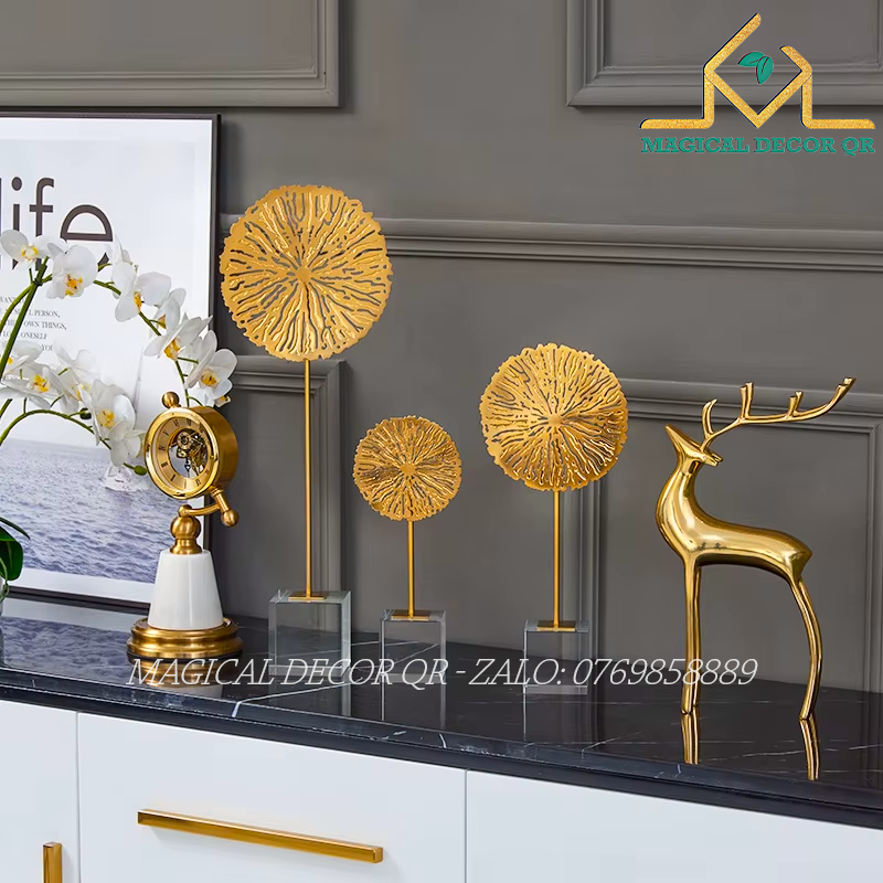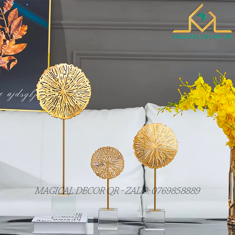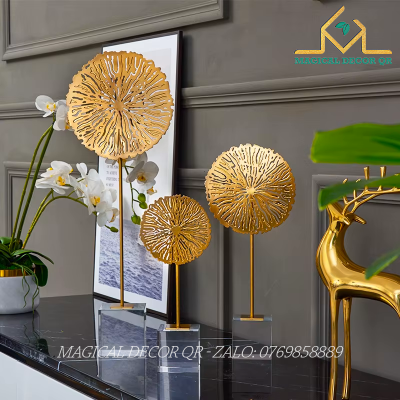 Thiết kế ba kích thước lớn – vừa – nhỏ mang đến bố cục hài hòa, tạo cảm giác chuyển động tự nhiên như những tán cây đang lay nhẹ trong gió. Lớp mạ vàng sáng bóng cùng kết cấu đế vững chắc giúp sản phẩm không chỉ đẹp mắt mà còn có giá trị thẩm mỹ và phong thủy cao.